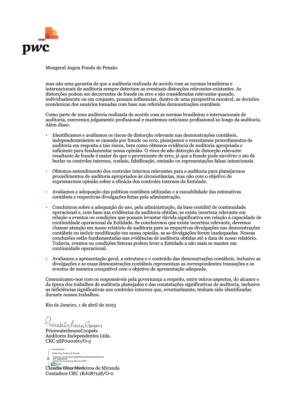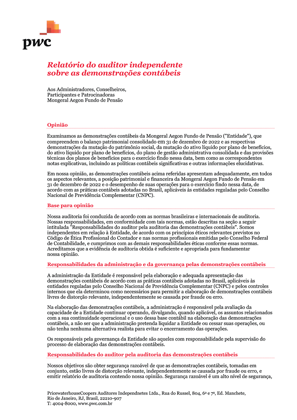O Conselho Fiscal do Mongeral Aegon Fundo de Pensão, no uso de suas atribuições legais e estatutárias, examinou as Demonstrações Contábeis pertinentes às operações realizadas pela Entidade no exercício social encerrado em 31 de dezembro de 2022 e demais documentos previstos nos normativos regulatórios vigentes, a fim de poder expressar opinião sobre os atos praticados pela administração, verificando o cumprimento de seus deveres legais e estatutários, e os respectivos reflexos nas demonstrações contábeis. Com base nos documentos examinados e nos esclarecimentos prestados pela Diretoria Executiva da Entidade, este Conselho é da opinião de que os atos da administração foram praticados em atendimento aos preceitos da legislação e do Estatuto da Entidade, estando adequadamente refletidos, em seus aspectos relevantes, nas demonstrações contábeis, referentes ao exercício findo em 31 de dezembro de 2022, pelo que manifesta-se favoravelmente à sua aprovação pelo Conselho Deliberativo.